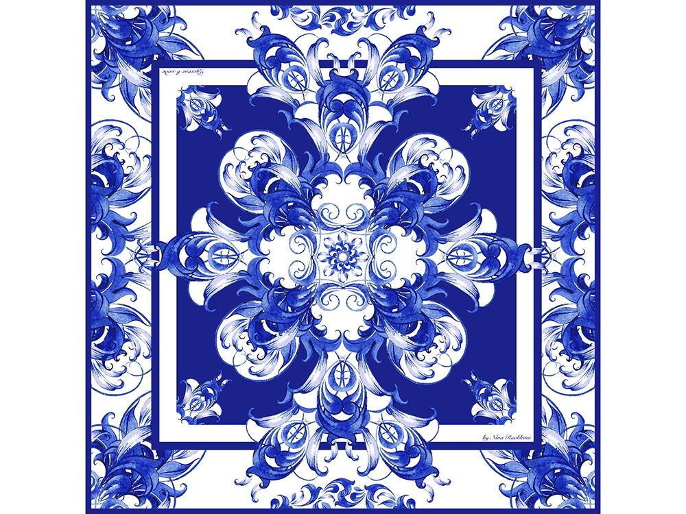 Платок «Гжель» от бренда «Русские в моде» выполнен в технике знаменитой кобальтовой росписи. Узоры в тонких оттенках синего цвета, размещенные на белом фоне, — один из самых распространенных рисунков гжель, чья форма столетиями доводилась мастерами до совершенства. На полотне восхитительные соцветия тугих бутонов и ажурных лепестков гармонично соседствуют с узнаваемыми сине-голубыми завитками, спиралями и линиями.