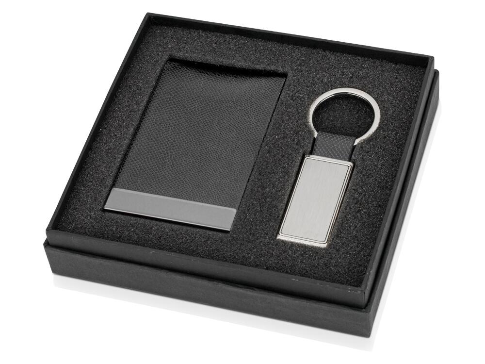 Визитница из кожзаменителя и металлический брелок прямоугольной формы - идеальный тандем из бизнес-атрибутов, которые всегда дополнят образ делового человека и принесут ему пользу. Набор можно персонализировать методом гравировки.
