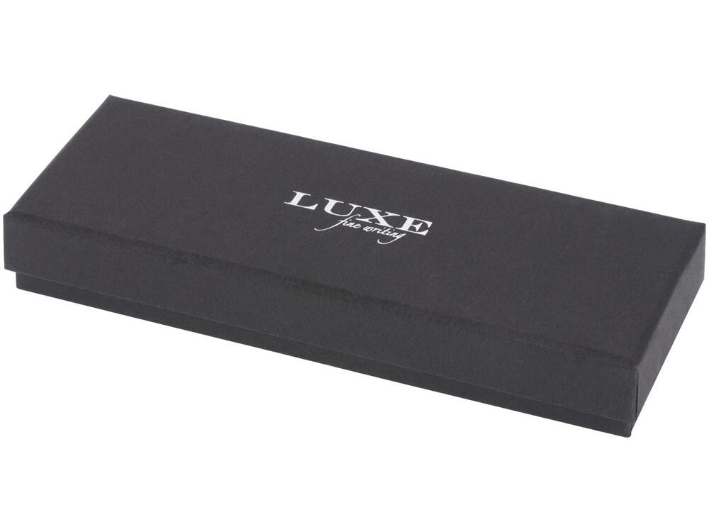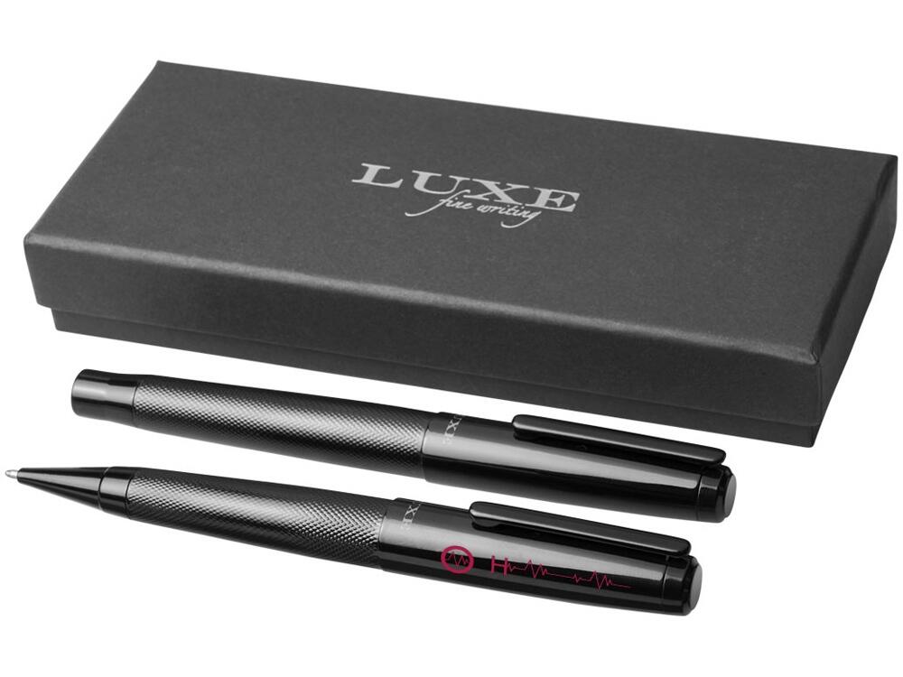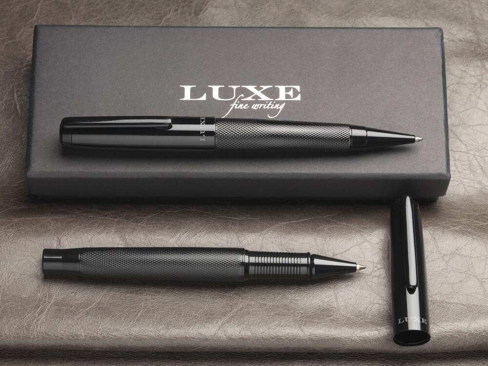 Подарочный набор из двух ручек Gloss. Подарочный набор из шариковой ручки и ручки-роллера с черним колпачком и глянцевым корпусом в подарочной коробке LUXE. Шариковая ручка: 14 см х 1,45 см, вес: 40 г, длина непрерывной линии: 800 м. Ручка-роллер: 13,8 см х 1,45 см, вес: 54 г, длина непрерывной линии: 400 м. Металл.