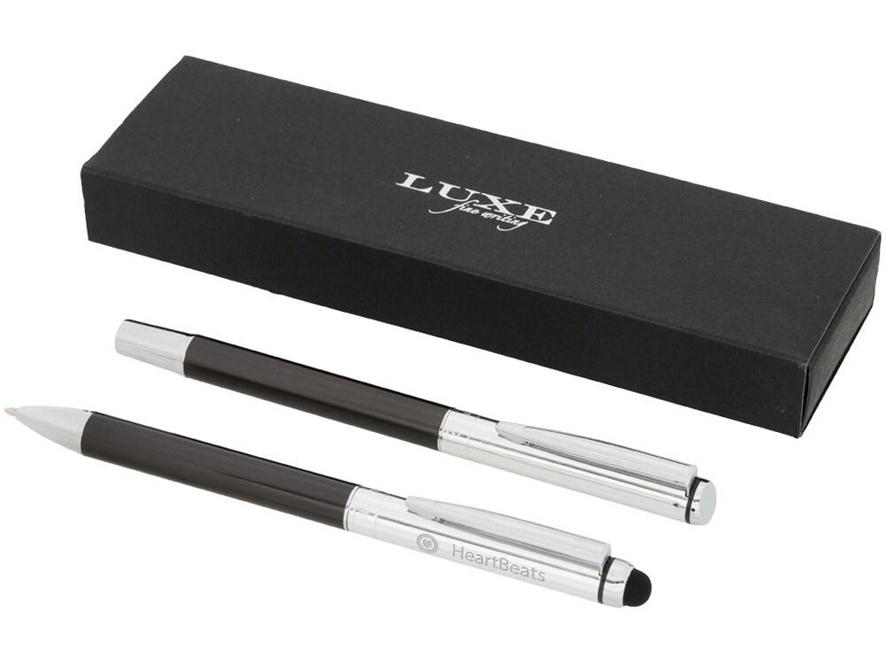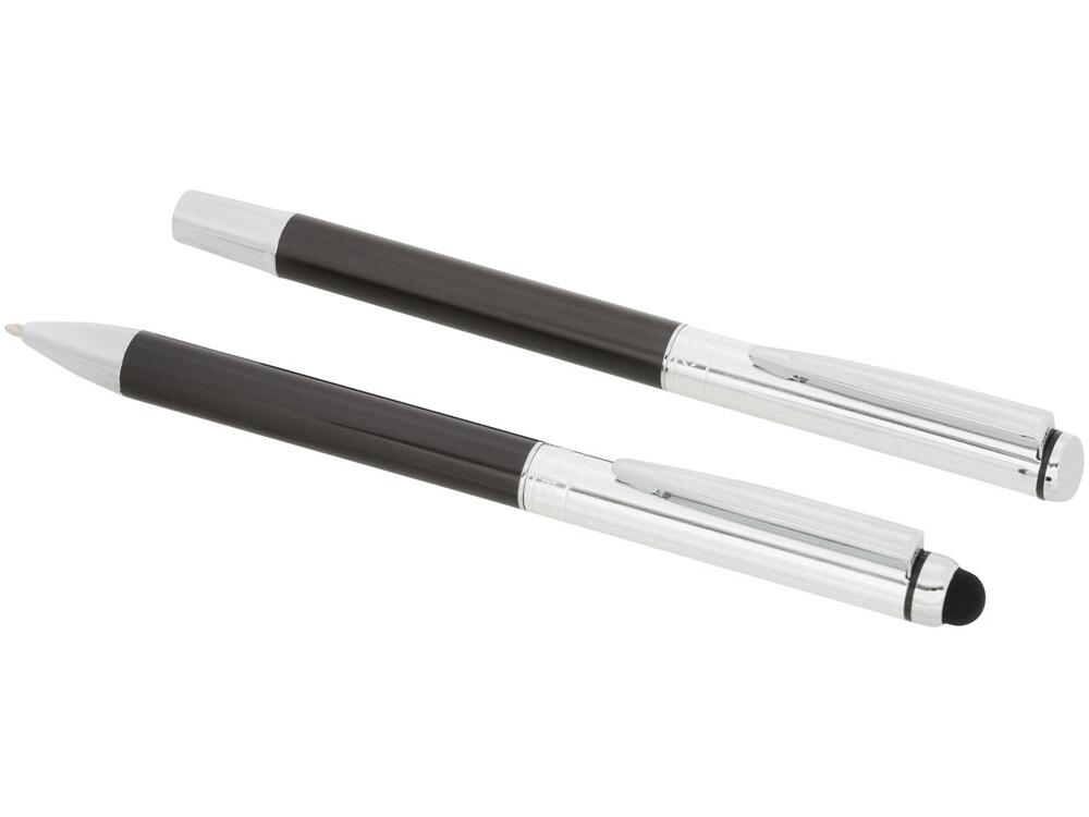 Набор с шариковой ручкой и ручкой-стилусом. Эксклюзивный набор ручек, включающий шариковую ручку-стилус и ручку-роллер. Обе ручки предлагаются с графитовой нижней частью корпуса и полированной хромированной верхней частью. В набор входят запасные чернила и стилус с прорезиненным наконечником для работы с планшетами и смартфонами. Предлагается в подарочной коробке LUXE (17 x 5,5 x 3 см). Металл.