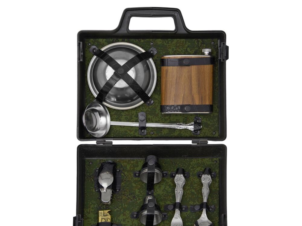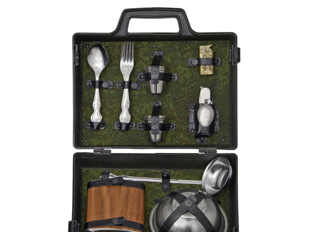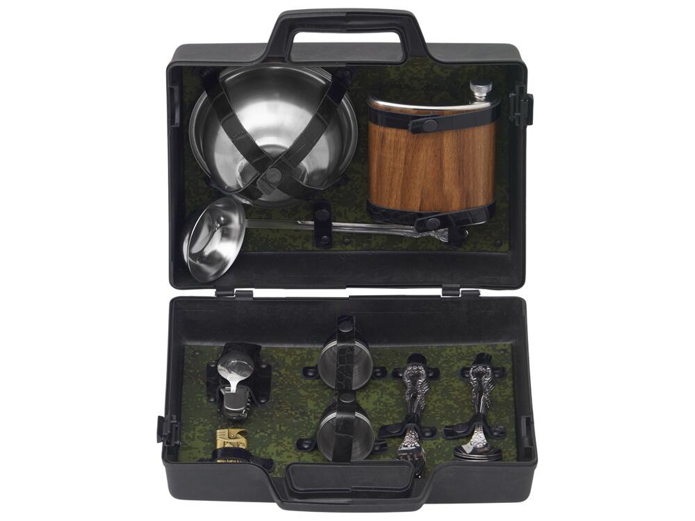 Все элементы набора выполнены из качественной нержавеющей стали, что обеспечивает долговечность и легкость в уходе. Упакованы в пластиковый кейс и надежно закреплены ремешками из натуральной кожи, что обеспечивает удобство транспортировки и сохранность содержимого.
