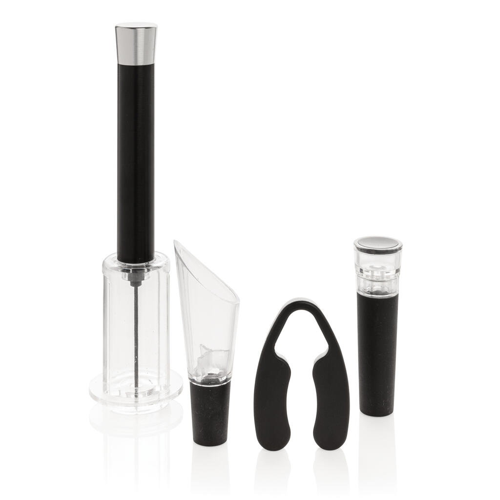 В этом наборе собрано все, чтобы открывать, подавать и хранить ваши любимые вина. В комплект входит пневматический штопор, обрезатель фольги, вакуумная пробка и аэратор для удобного разлития напитков. Поставляется в подарочном тубусе.