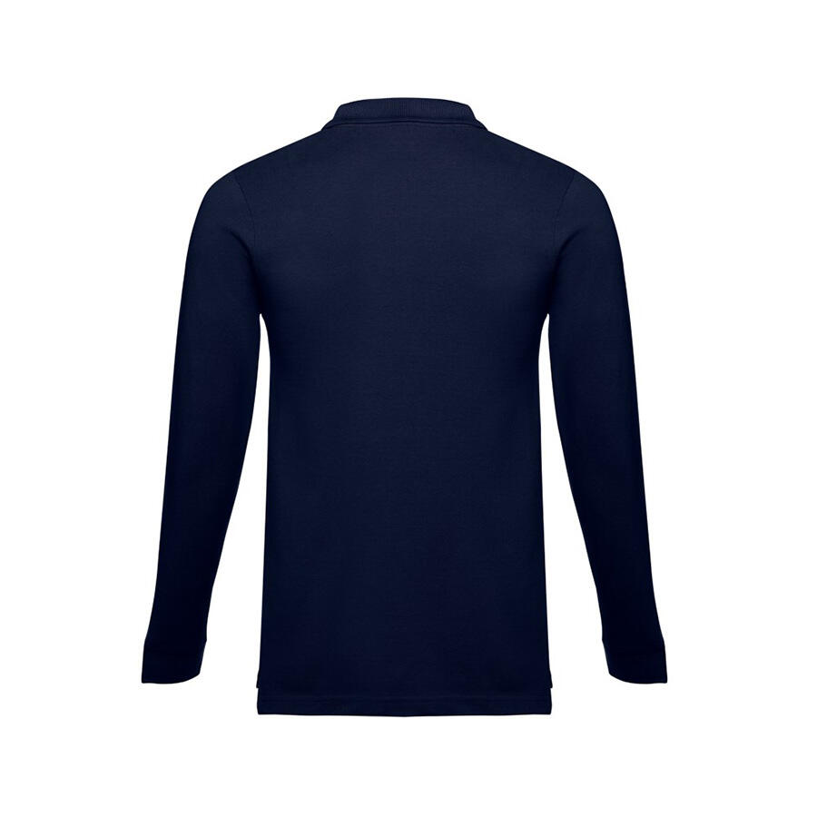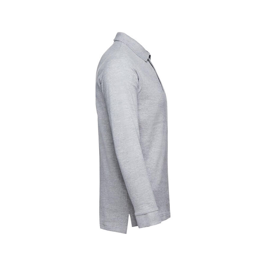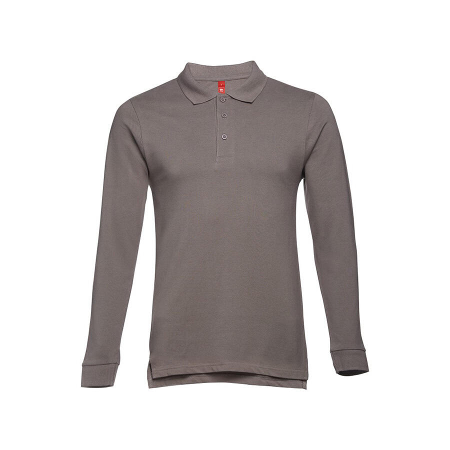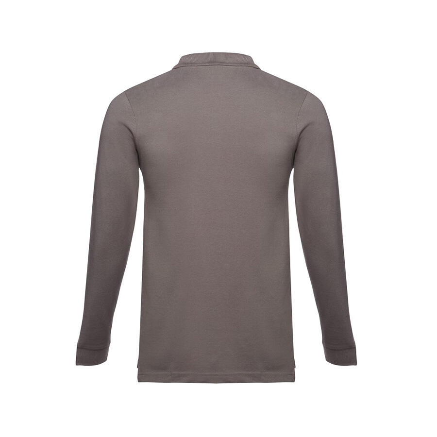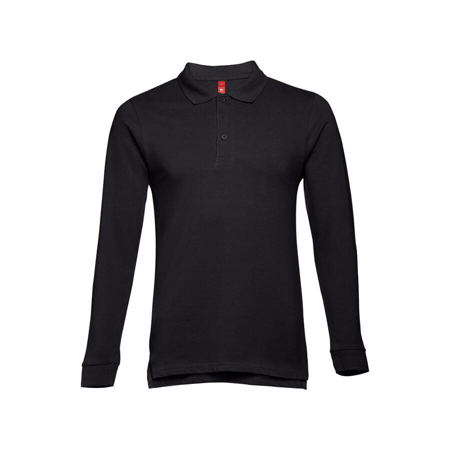 Мужская рубашка-поло с длинным рукавом из хлопковой ткани-пике. Полотно футболки упругое и гладкое благодаря обработке ферментами "enzyme wash" и сохраняет форму при стирке. Модель полуприлегающего силуэта. Благодаря манжете из риба 1х1 рукав смотрится очень аккуратно. Воротник также выполнен из риба 1х1, внутри ворота - укрепляющая тесьма по горловине. Планка с 3 пуговицами в цвет основной ткани изделия. Запасная пуговица на ярлыке во внутреннем боковом шве.