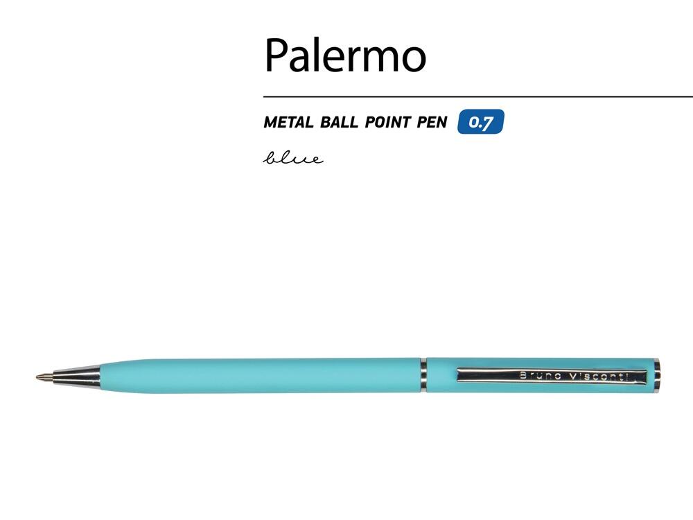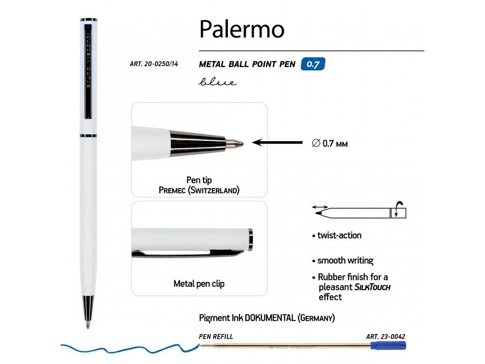 Автоматическая металлическая ручка "Bruno Visconti" серии "Palermo" однотонного цвета порадует любителей всего изящного и утонченного. Покрытие корпуса Soft Touch гарантирует дополнительный комфорт в работе с ней. Стержень легко выдвигается благодаря поворотному механизму. Синие пигментные чернила Dokumental (Германия) и пишущий узел Premec (Швейцария) обеспечивают качественное и мягкое письмо.