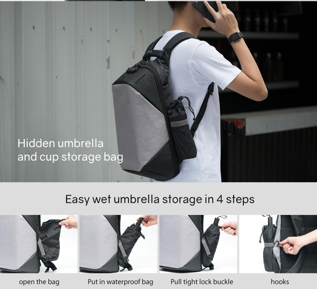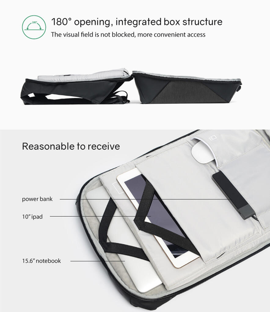 Конструкция рюкзака позволяет раскрыть его на 180°, чтобы аккуратно уложить в рюкзак много различных предметов. Дополнительно в основном отделении расположены еще 8 карманов различного функционала. 6 открытых карманов под ручки и различные мелочи, 1 карман на молнии и карман на липучке для powerbank, в который приходит USB-кабель системы зарядки K EasyCharging, соединенный с USB-портом в борту на внешней стороне рюкзака для легкого подключения к смартфону.