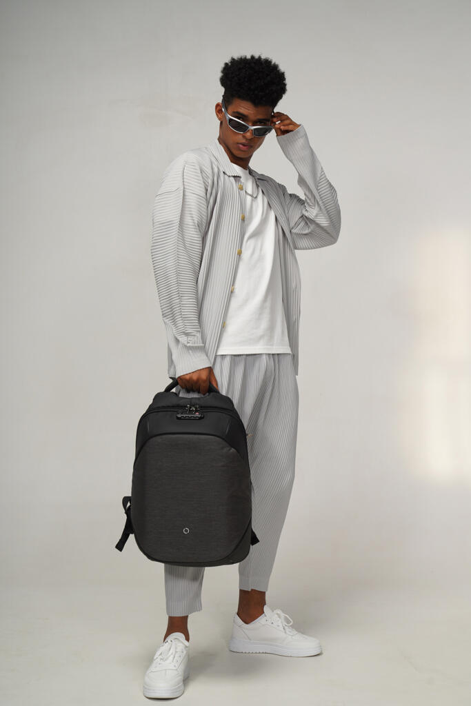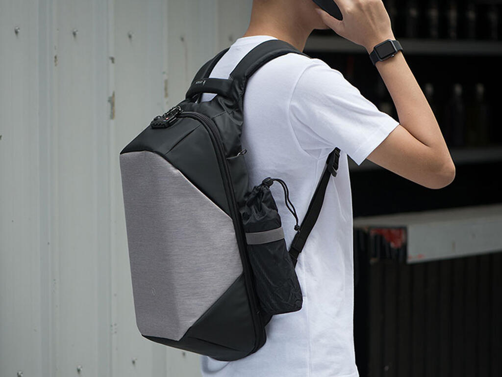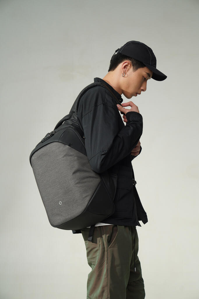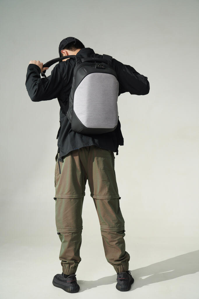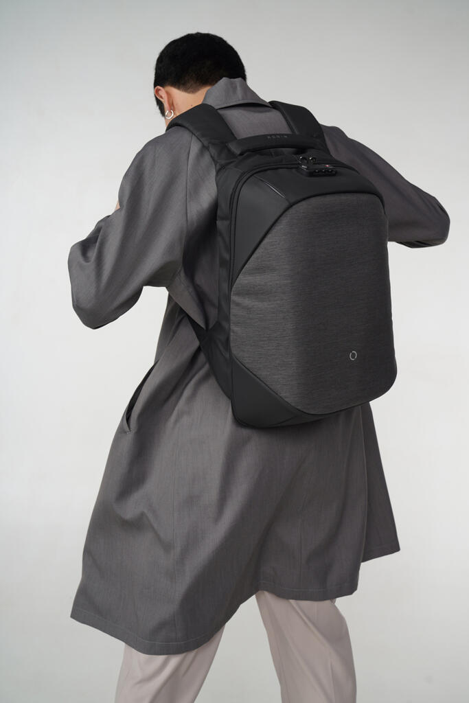 Вместительный рюкзак для путешественников ClickPack из комбинации темно-серого и черного цветов, обладатель премий Good Design Award 2017, Red Dot Design Award 2018, iF Design Award 2018, International Design Excellence Award. Сделан из прочного устойчивого к трению водоотталкивающего многослойного полиэстера, с двухслойной защитой от дождя и не требующего специального ухода. Конструкция достаточно жесткая, не деформируется. Детально продуманная организация отделений позволяет грамотно распределить вес. Самые тяжелые предметы располагаются ближе к спине, например, в отделении для ноутбука диагональю и в кармане для планшета. Благодаря плотным перегородкам и эластичным фиксаторам ноутбук и планшет надежно фиксируются и не перемещаются при ходьбе. Специальная анатомическая конструкция и вентилируемая мягкая спинка снижают нагрузку на плечи и спину, вес рюкзака воспринимается на 20-25% легче, чем при использовании стандартных моделей рюкзаков.
