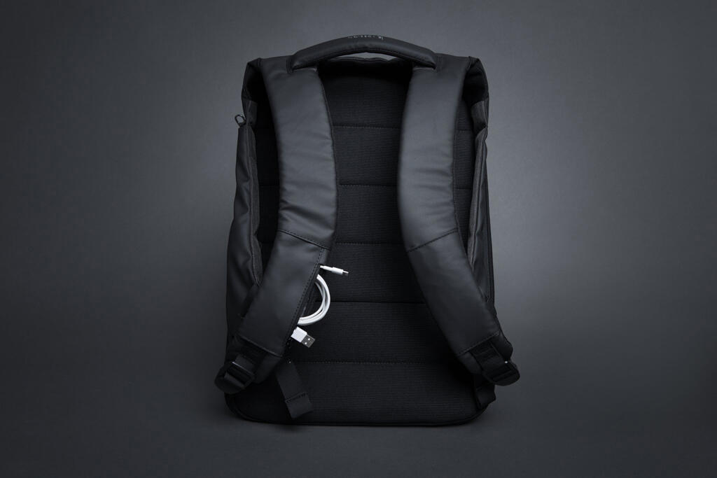 Конструкция рюкзака позволяет раскрыть его на 180°, чтобы аккуратно уложить в рюкзак много различных предметов. Дополнительно в основном отделении расположены еще 9 карманов различного функционала. 7 открытых карманов под мелочи, 2 кармана на молниях, в который можно поместить powerbank, т к в него приходит USB-кабель (600 мм, 0,5-0,7 А, 5В), соединенный с портом на внешней стороне рюкзака для легкого подключения к смартфону. Это оригинальная запатентованная система зарядки K EasyCharging 1.0 с помощью USB-порта, расположенного в борту рюкзака, и кабеля, идущего к powerbank, что делает мобильную зарядку более удобной.