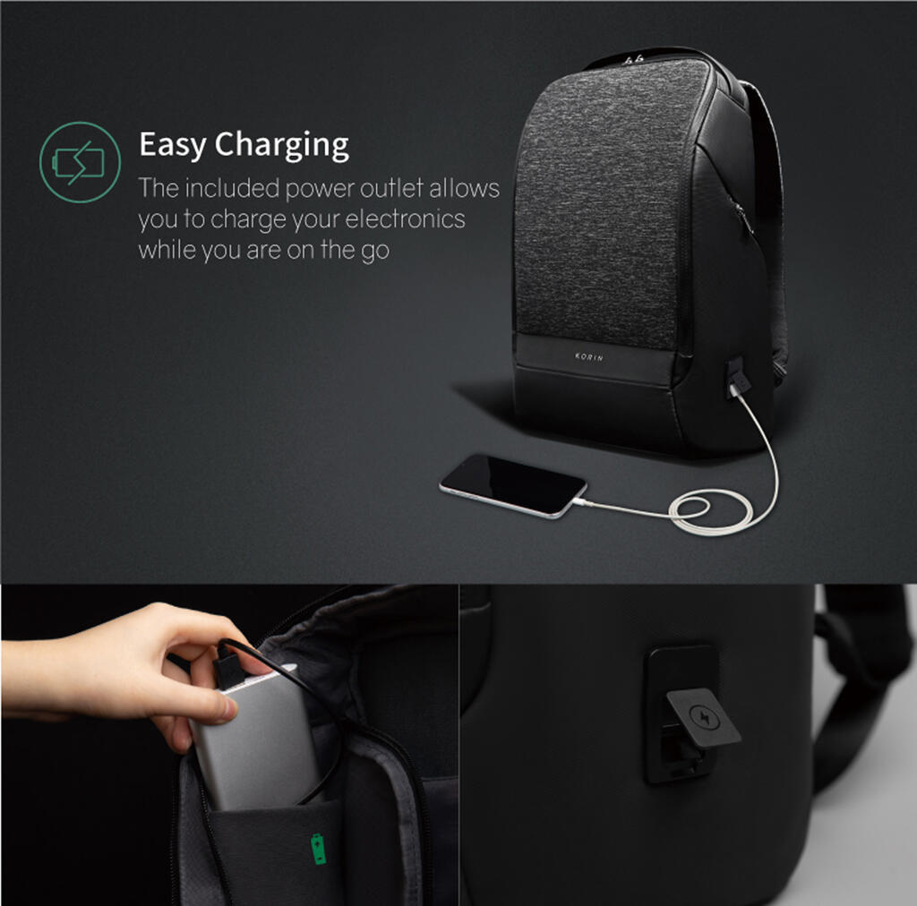 Конструкция рюкзака достаточно жесткая, не деформируется. Внутри рюкзака есть специальный карман, в который можно поместить powerbank, т к в него приходит USB-кабель (600 мм, 0,5-0,7 А, 5В), соединенный с портом на внешней стороне рюкзака для легкого подключения к смартфону. Это оригинальная запатентованная система зарядки K EasyCharging 1.0 с помощью USB-порта, расположенного в борту рюкзака, и кабеля, идущего к powerbank, что делает мобильную зарядку более удобной.