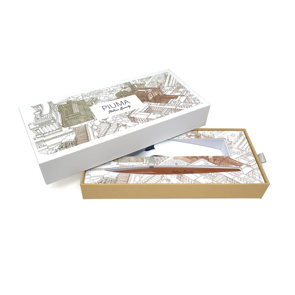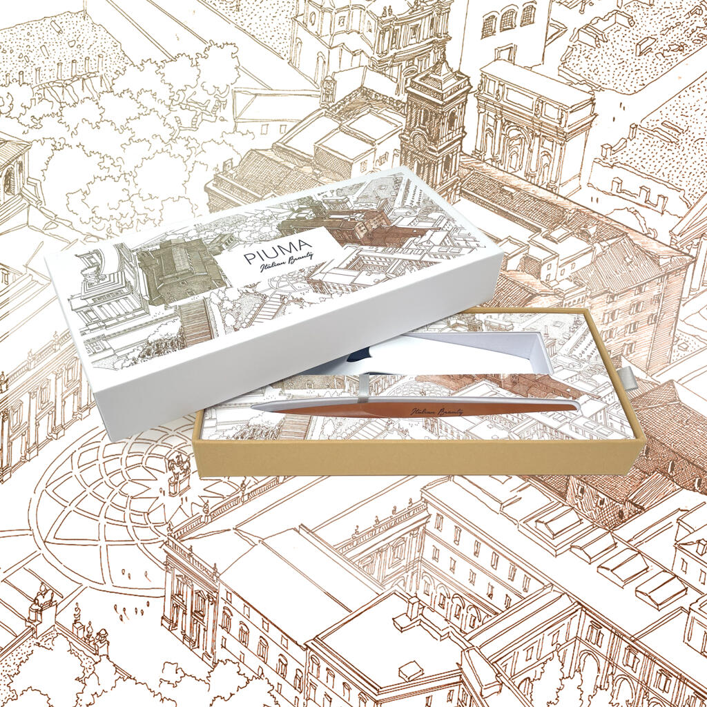 Шариковая ручка Pininfarina Piuma Рим из лимитированной коллекции дизайнеров Pininfarina в сотрудничестве с Francesco Corni Foundation, посвященной красоте Италии и представленной 8 городами. Франческо Корни - выдающийся дизайнер из Модены, посвятивший свою жизнь популяризации истории и архитектуры. Используя трехмерное перспективное видение, он изучает наиболее значимые здания каждого города, выбирает наилучшую точку обзора, чтобы подчеркнуть их особенности, и прорисовывает детали в древней технике калиграфии. Дополняет видение мастера умелое использование цветов, по одному для каждого города. Для Рима дизайнер выбрал центральной точкой площадь Piazza del Campidoglio и коричневый цвет, в результате подарочная коробка c ручкой Pininfarina PIUMA становится произведением искусства. PIUMA - ручка динамической формы в виде гусиного пера. Дизайнеры вдохновлялись Кодексом о полете птиц мастера Леонардо да Винчи, целью которого было понять тайну полета и который хранится сейчас в Королевской библиотеке Турина. Piuma находится в постоянном равновесии со своим центром тяжести благодаря белому стальному пьедесталу. На ручке стильный логотип Italian Beauty, она полностью сделана из дерева груши. В ручке используется шариковый стержень Schmidt ® S635 (D1) с синей пастой. Набор упакован в белую подарочную коробку.