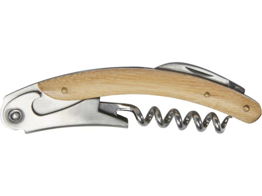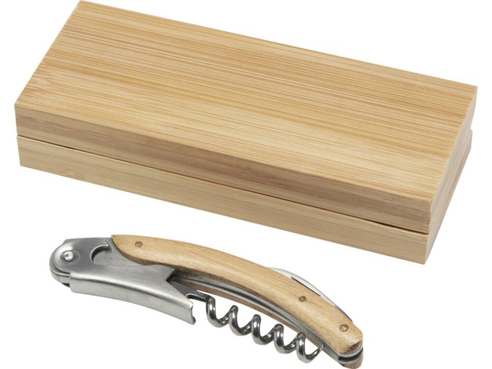 Нож официанта из нержавеющей стали со штопором и складным ножом для фольги и ручкой из натурального бамбука. Используемый бамбук поставляется и производится в соответствии со стандартами устойчивого развития.