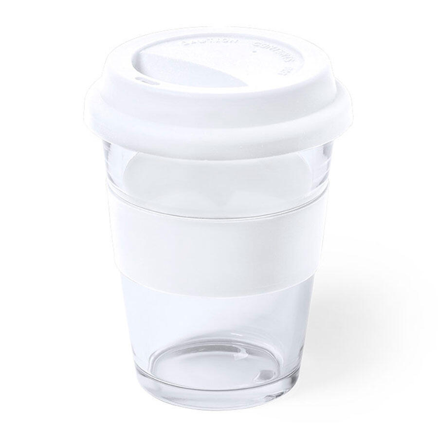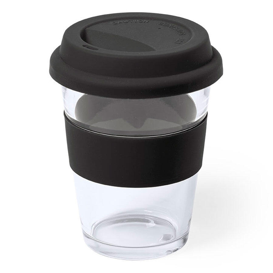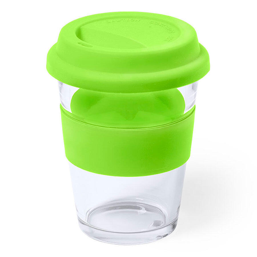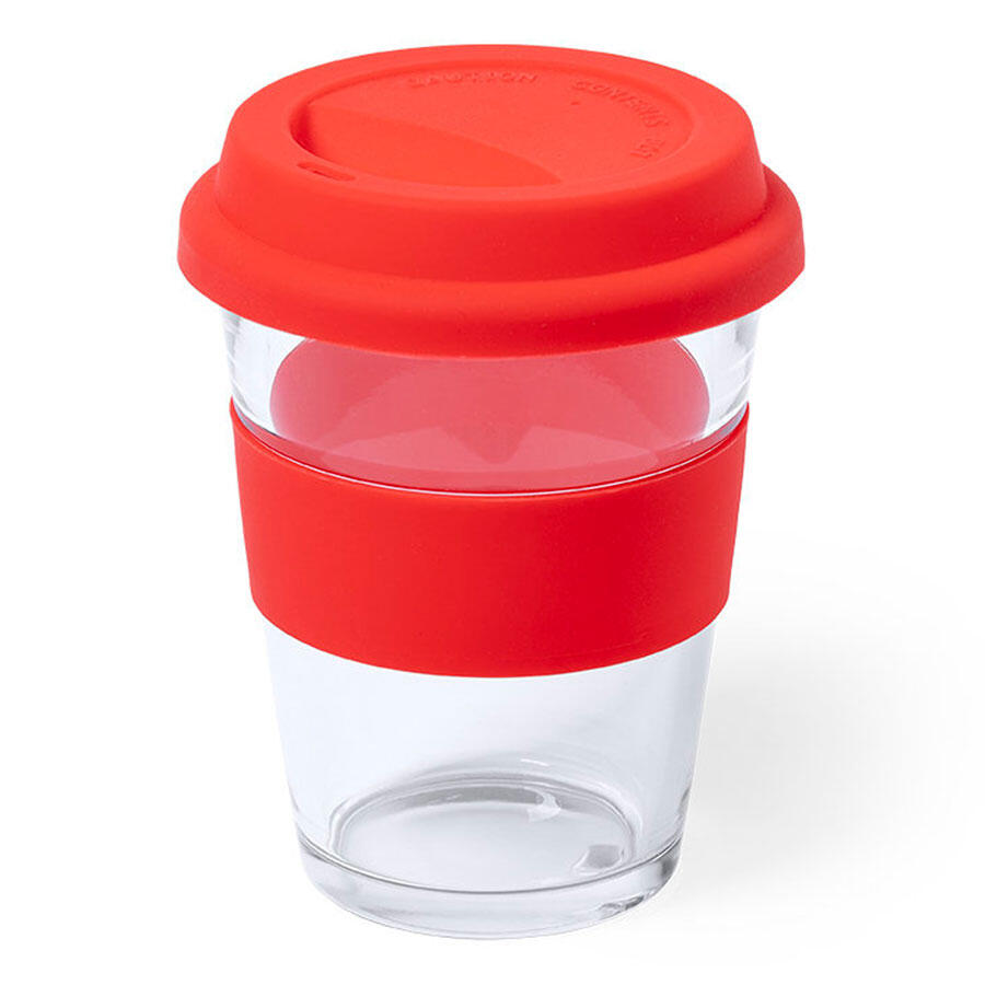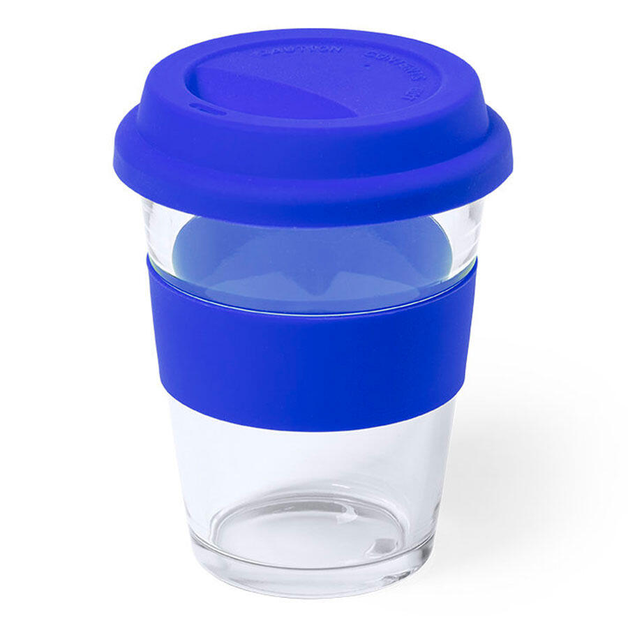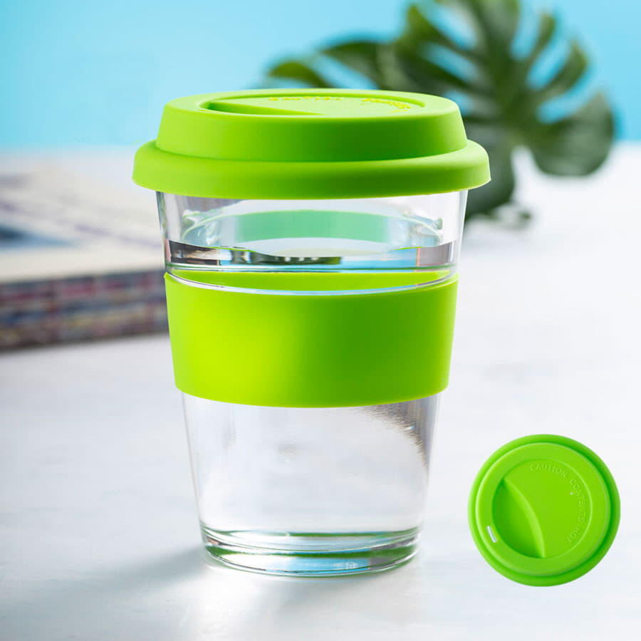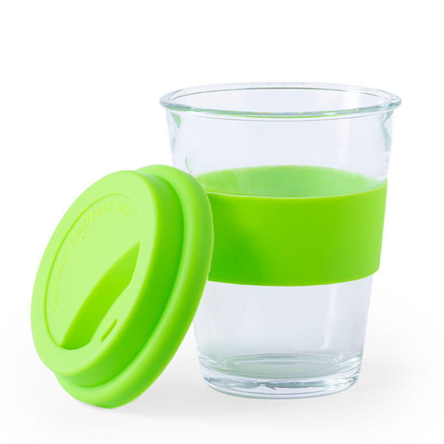 Стеклянный стакан с цветной силиконовой крышкой и манжетой.