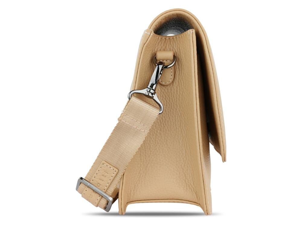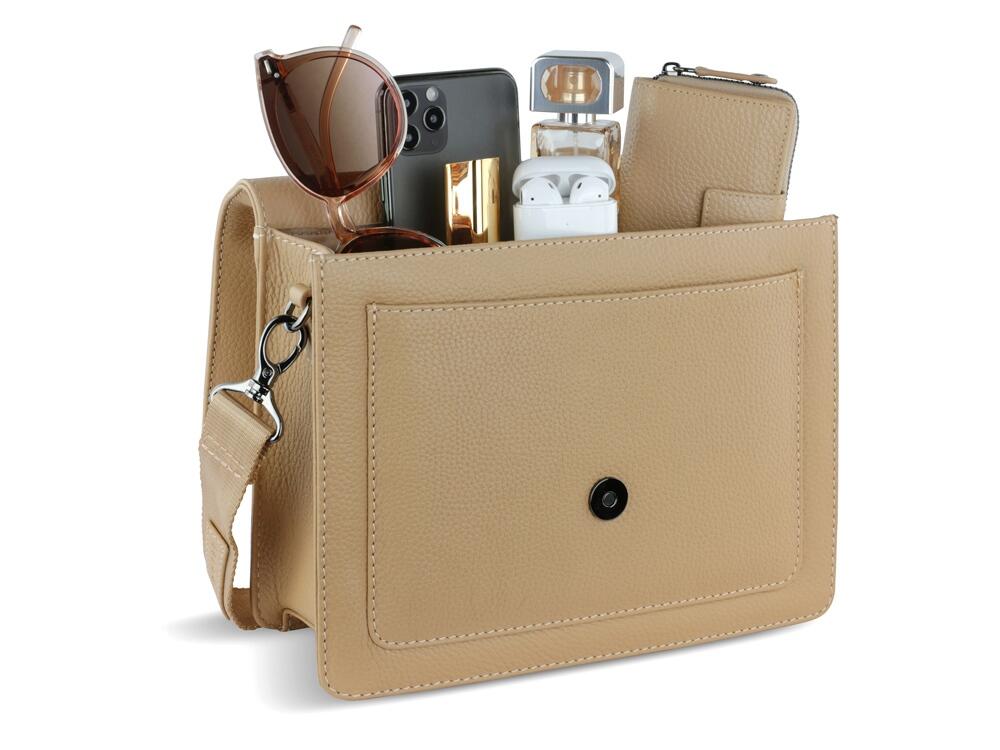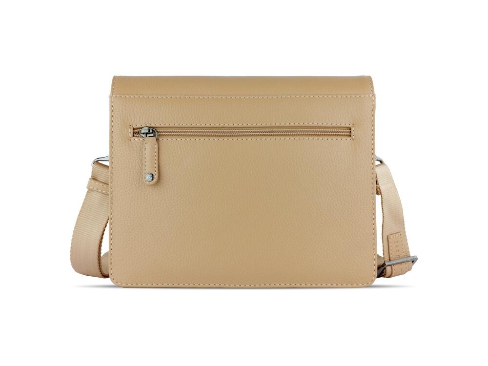 Функциональная организация: основное отделение на магнитной кнопке с карманом на молнии и открытым карманом, передний открытый карман, задний карман на молнии, съемный регулируемый плечевой ремень (до 130 см).