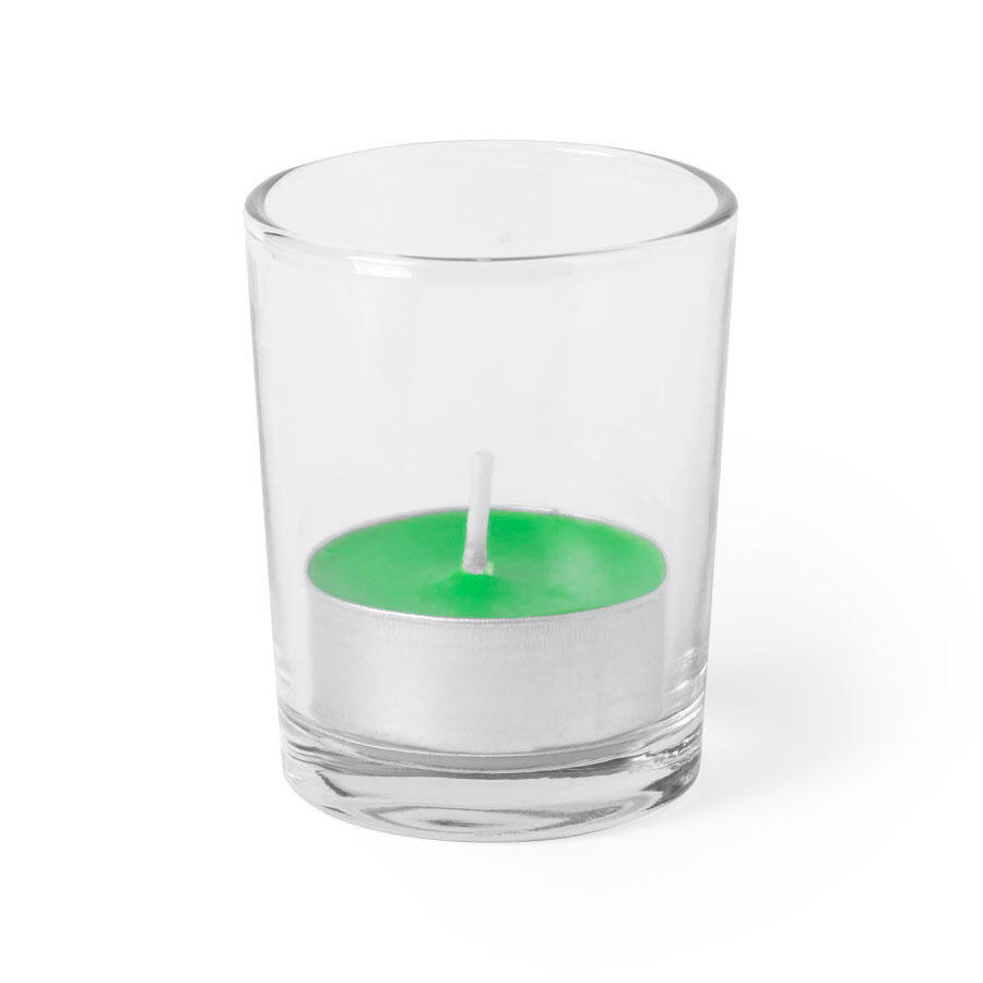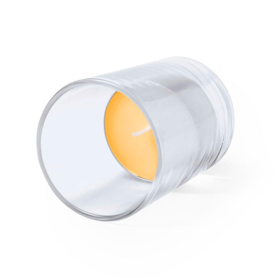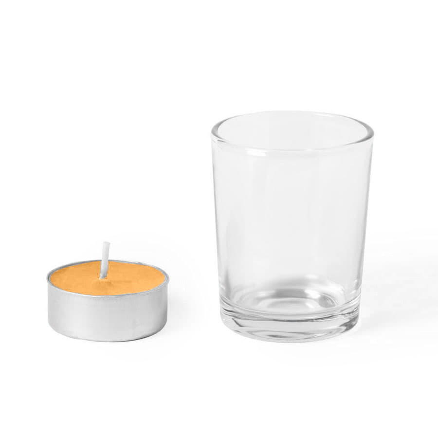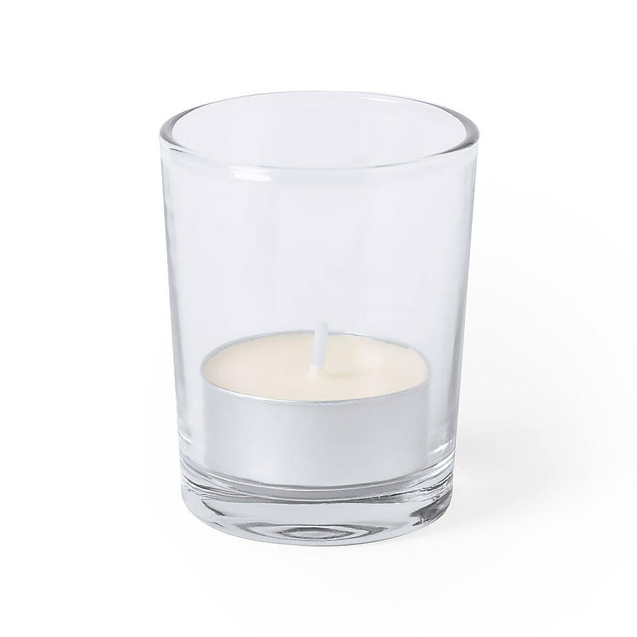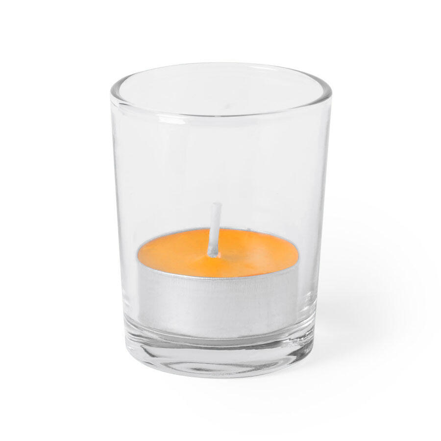 Свеча с ароматом ванили в стеклянном стаканчике.