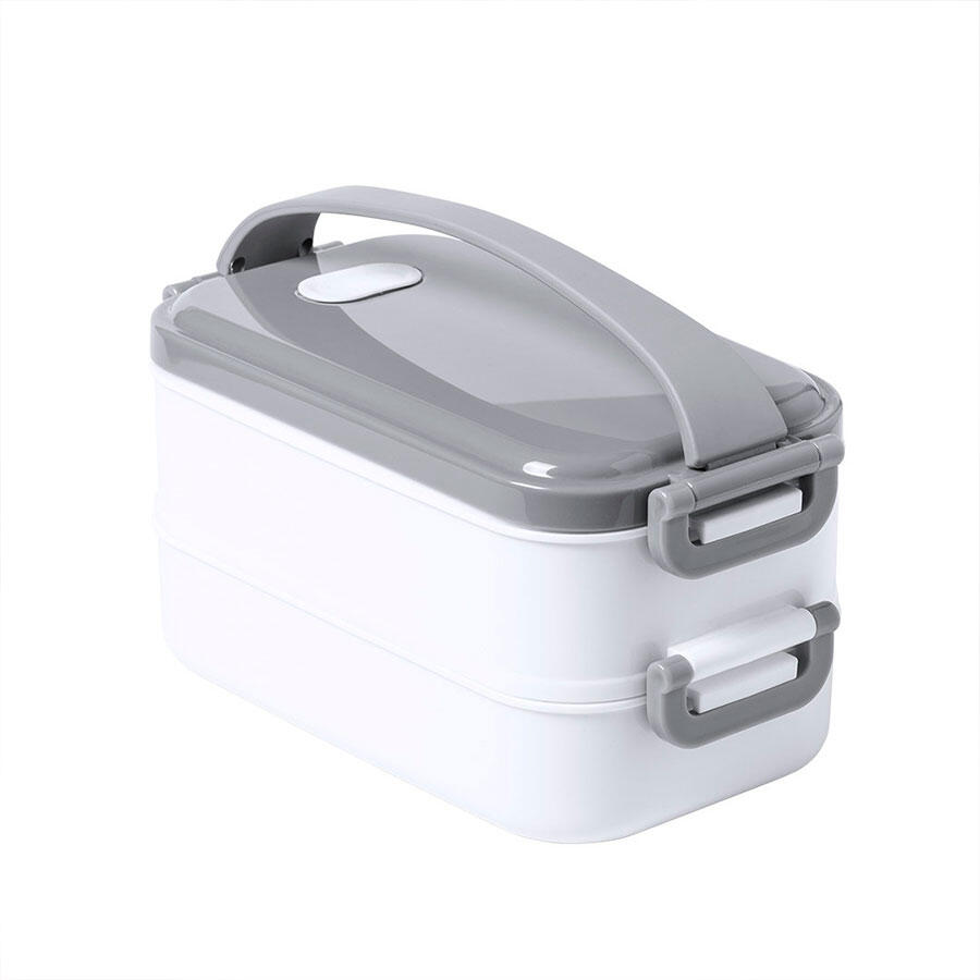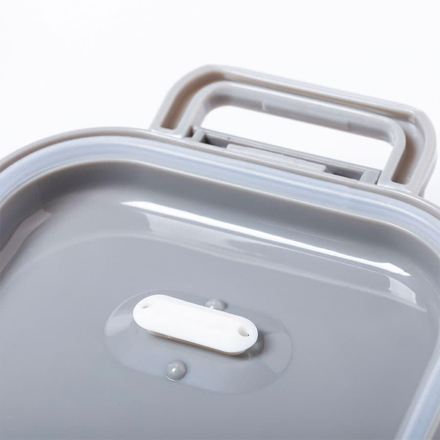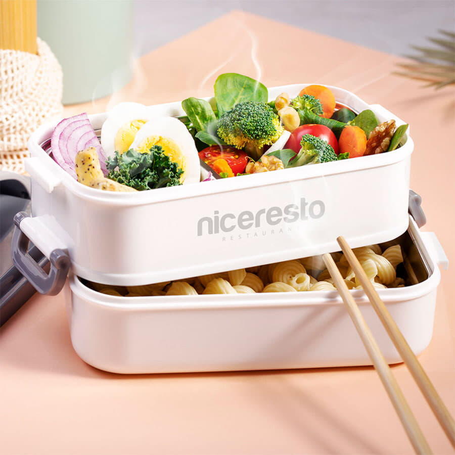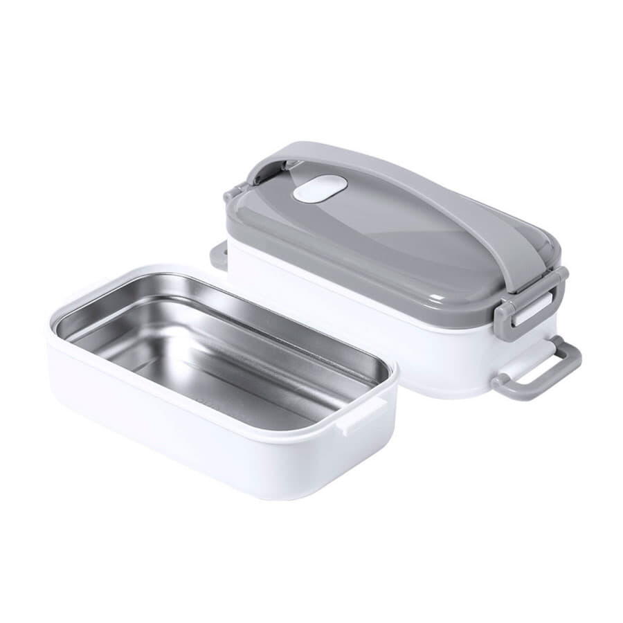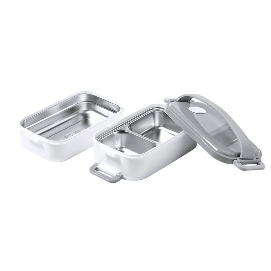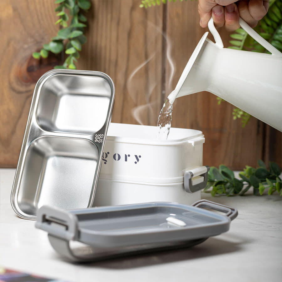 Термоланч-бокс с двумя контейнерами по 850мл и один из них разделен на два: 350 и 500мл. Контейнеры имеют металлические вставки из нержавеющей стали и крышки с уплотнительными резинками, для более плотного прилегания к емкостям.