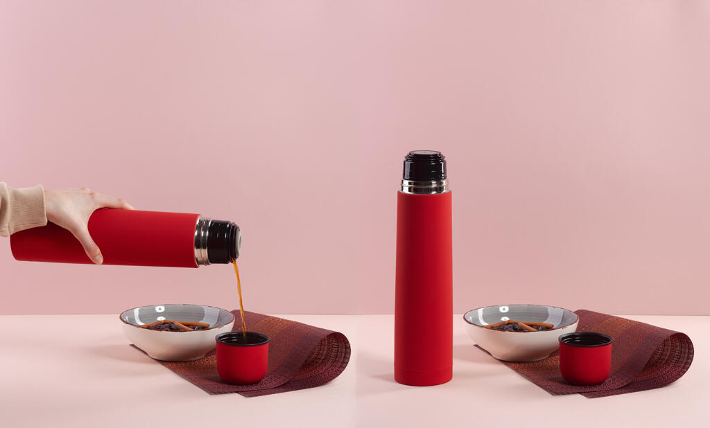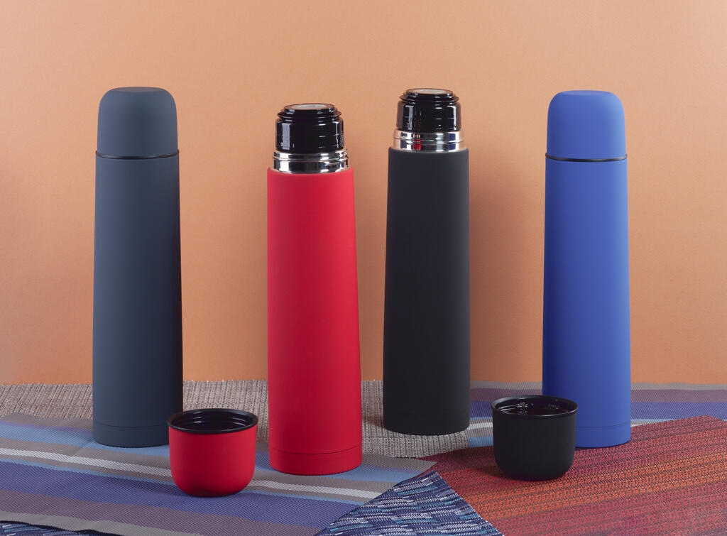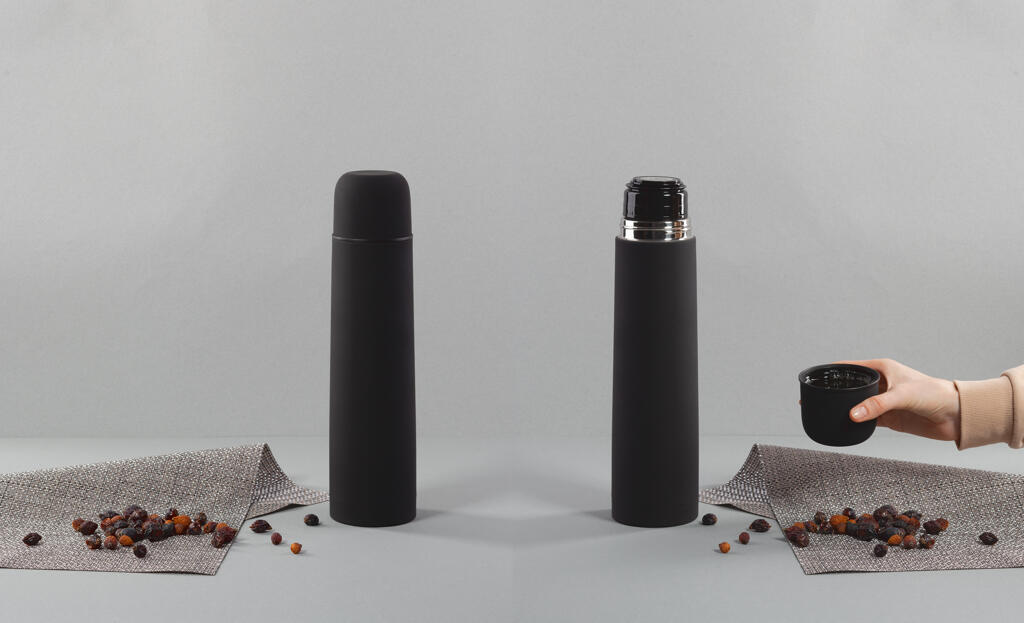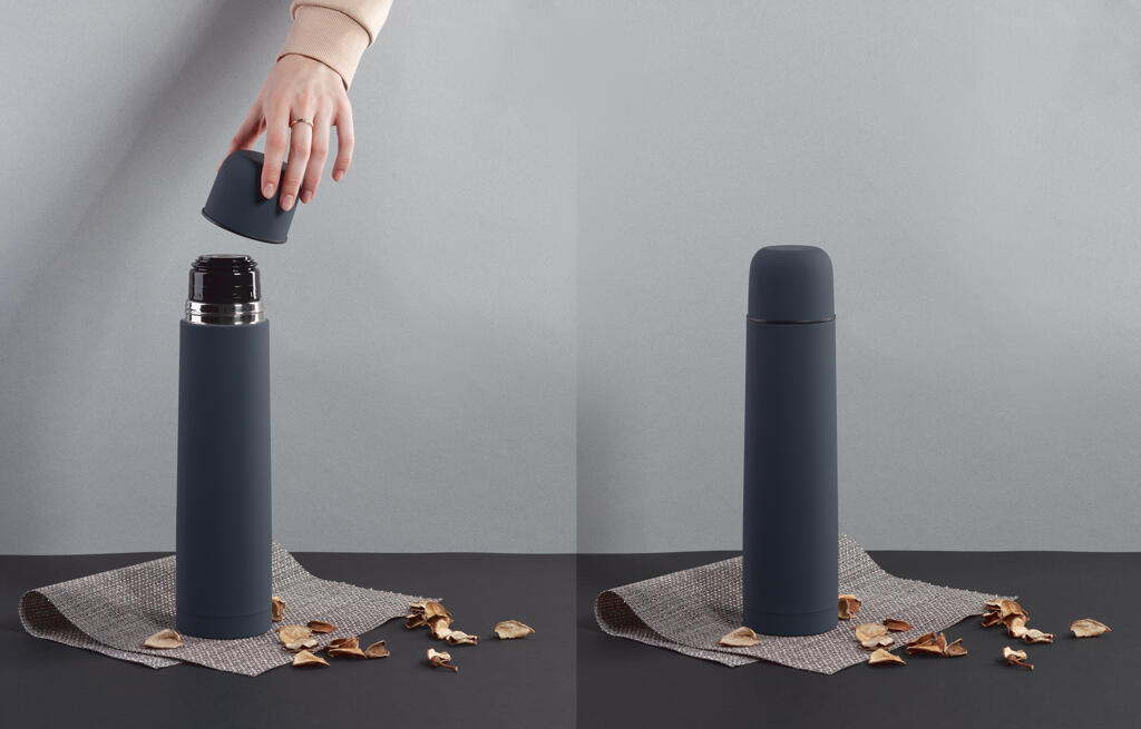 Внешняя стенка термостакана изготовлена из нержавеющей стали с уникальным прорезиненным напылением soft-touch, а внутренняя стенка выполнена из высококачественной пищевой, нержавеющей стали. Корпус изделия персонализируется по окружности встык. Термос оснащен пробкой с клапаном, которая позволяет наливать напиток одним нажатием.