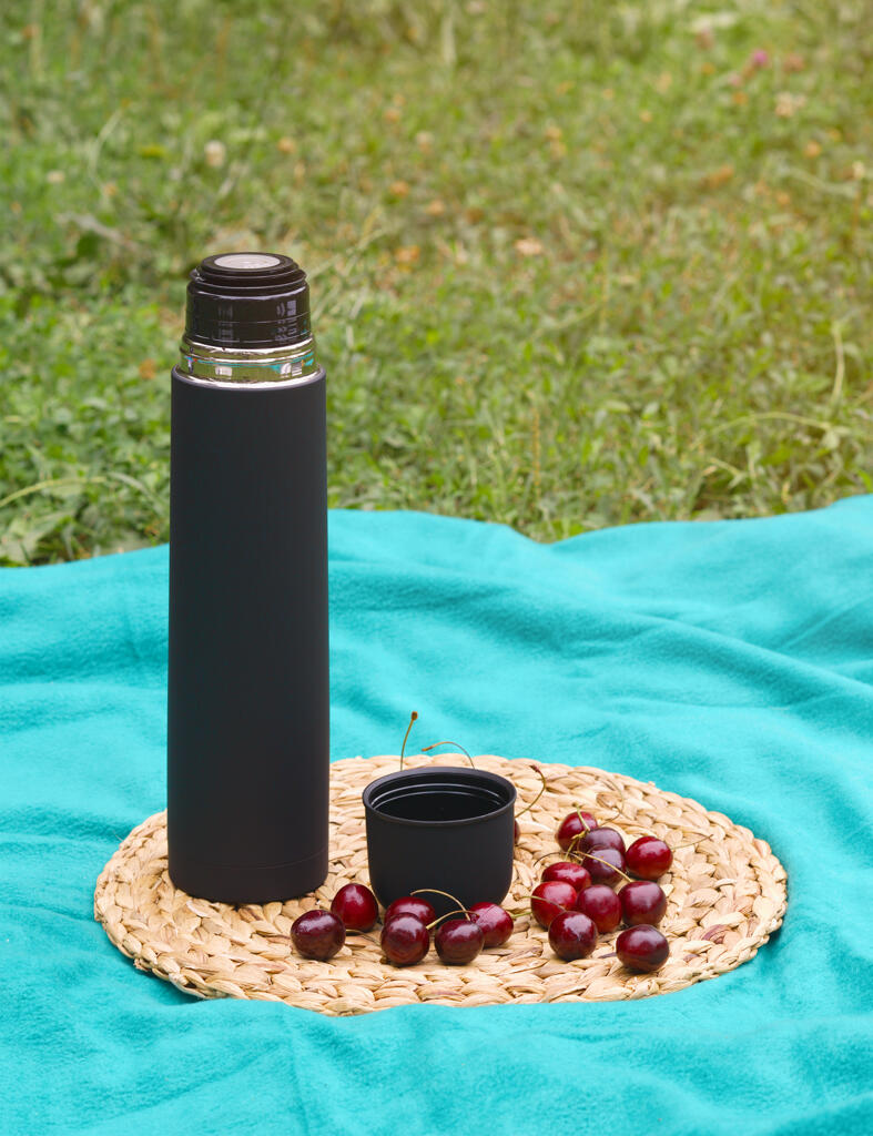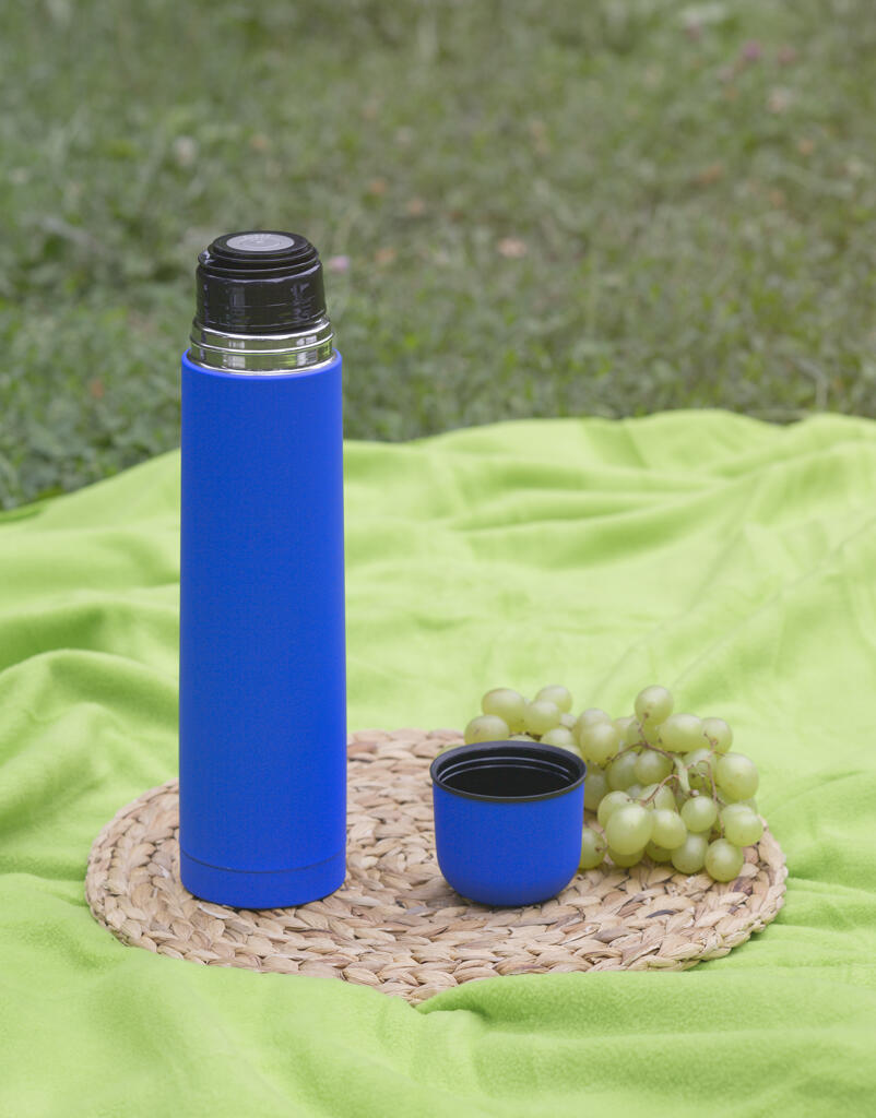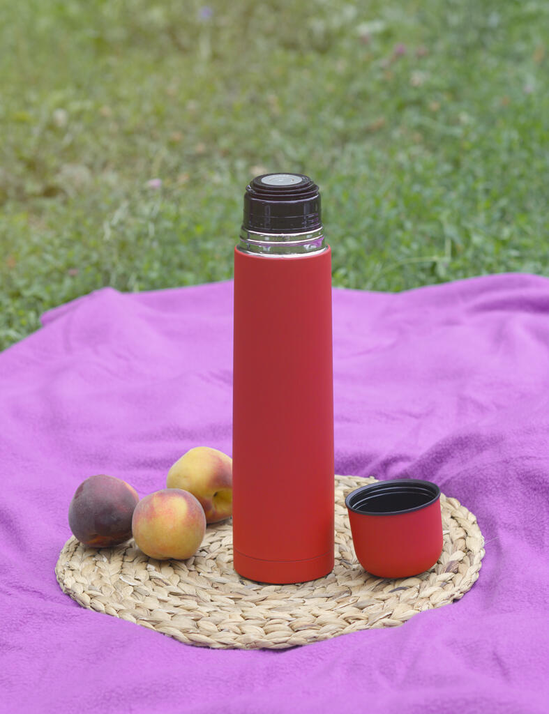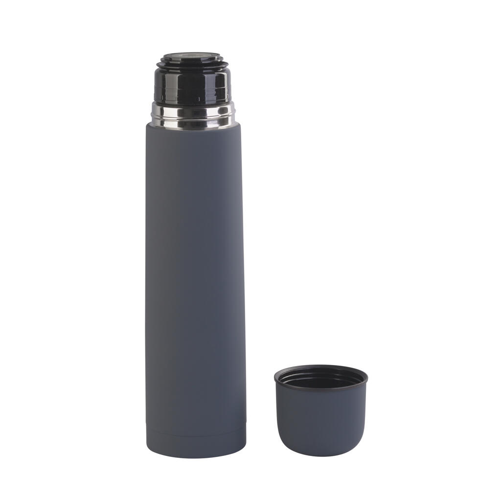 Внешняя стенка термостакана изготовлена из нержавеющей стали с уникальным прорезиненным напылением soft-touch, а внутренняя стенка выполнена из высококачественной пищевой, нержавеющей стали. Корпус изделия персонализируется по окружности встык. Термос оснащен пробкой с клапаном, которая позволяет наливать напиток одним нажатием.