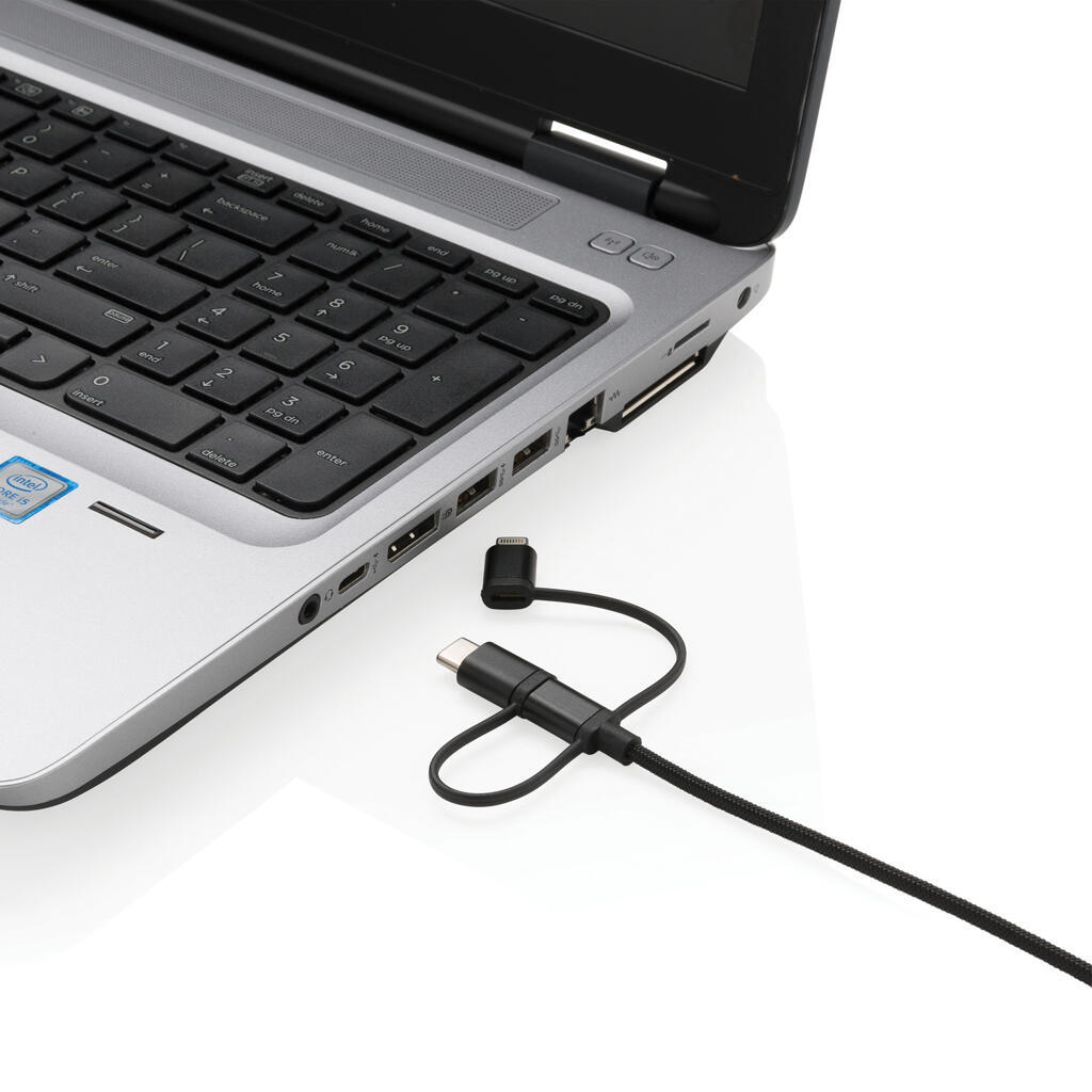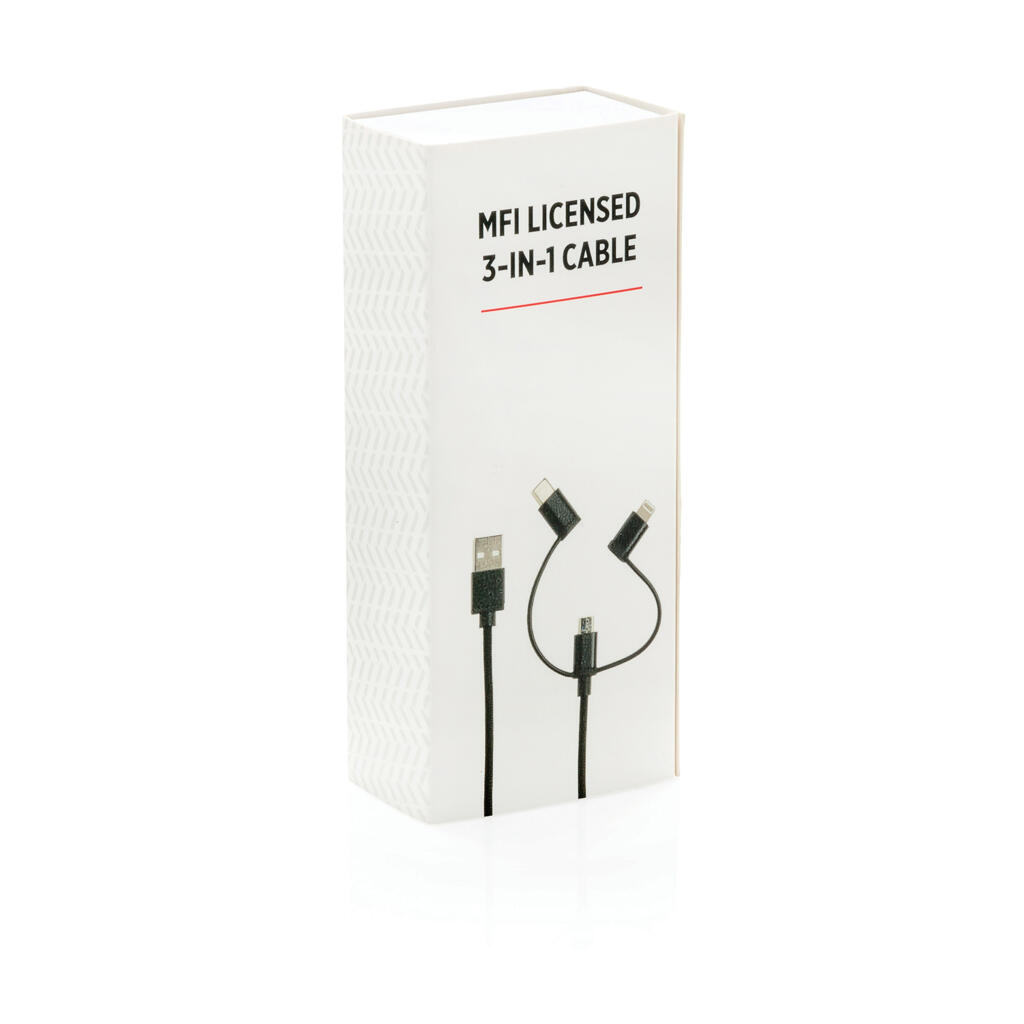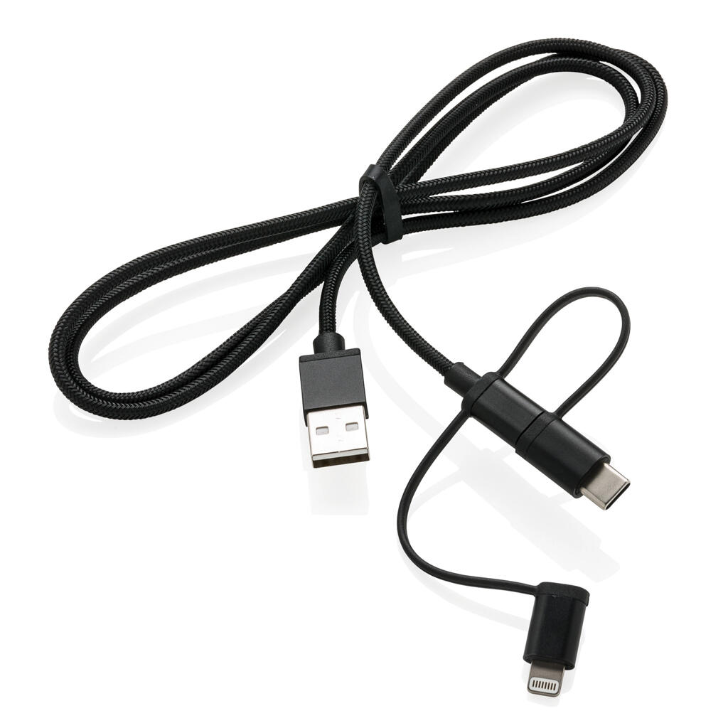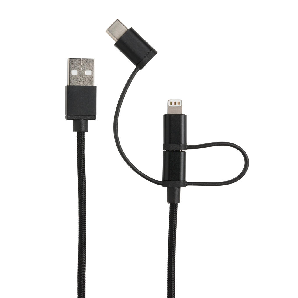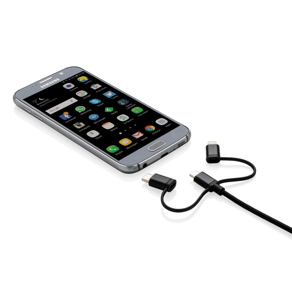Универсальный кабель с тремя выходами: micro-USB, Type-C и лицензированным MFi lightning подходит не только для зарядки мобильных устройств, но и для передачи данных. Длина кабеля составляет 1м. Идет в комплекте с удобным нейлоновым мешочком для хранения кабеля.
