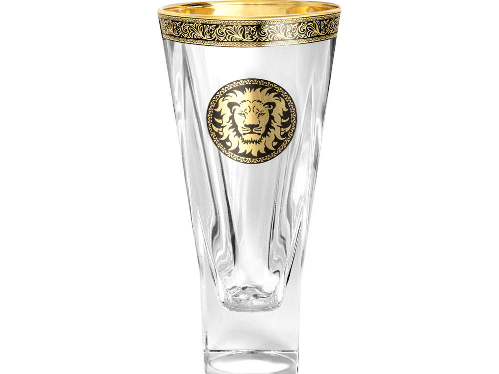 Ваза с изображением льва станет отличным украшением интерьера. Ваза выполнена из высококачественного прозрачного хрусталя с окантовкой из золотистого орнамента. В комплекте прилагается подарочная упаковка.