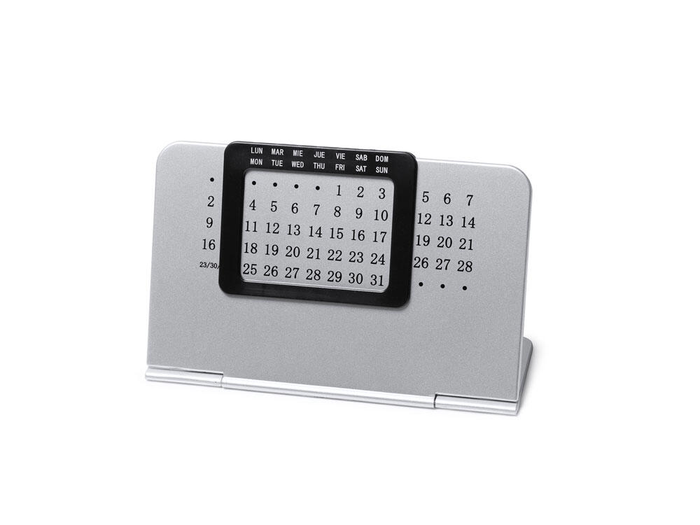 "Вечный" настольный календарь, состоящий из двух частей: одной серебряной подставки с числовой панелью и черной выдвижной рамки с днями недели на испанском и английском языках.