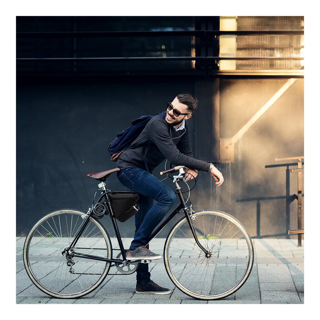 Велосипедная сумка из прочного полиэстера 600D на прорезиненной основе, легко закрепляется на раме велосипеда с помощью трех липучек.