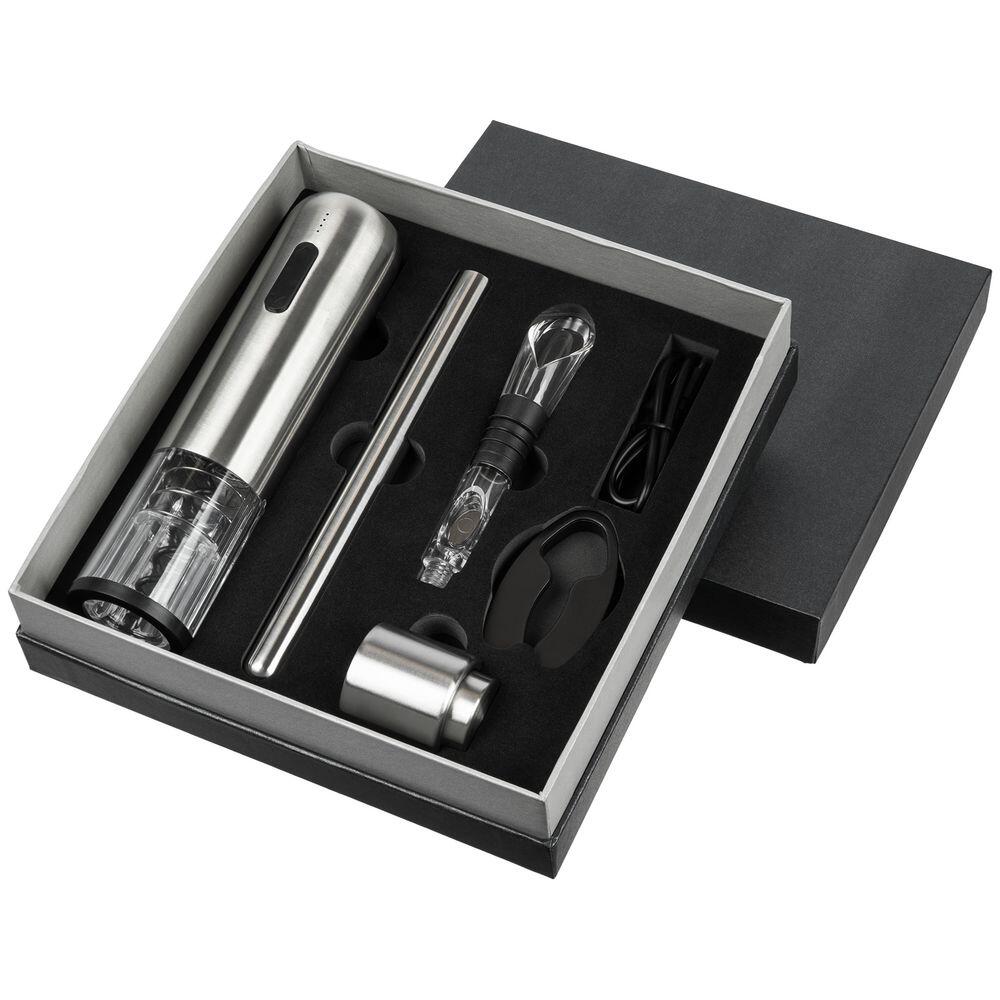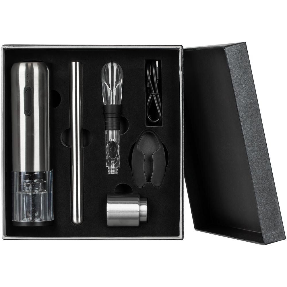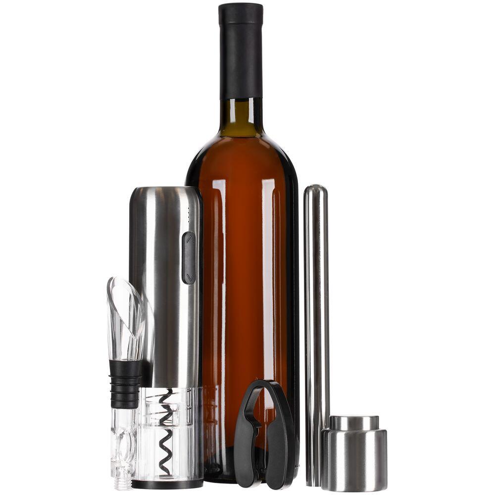 Набор Veritas — настоящая находка для ценителей вин. Благодаря продуманному дизайну использование автоматического штопора практически не требует участия человека. Изящный чиллер поддерживает температуру напитка до часа, удобная разливочная воронка дополнительно аэрирует вино и не позволяет пролить его мимо бокала, а небольшая вакуумная пробка сохраняет вкусовые свойства напитка в течение нескольких дней. Набор поставляется в подарочной коробке.