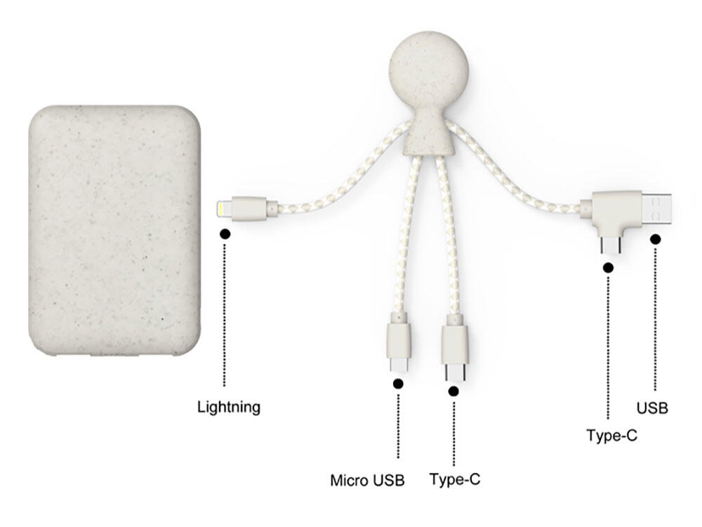 Внешний аккумулятор "BioPack" изготовлен из биоразлагаемого пластика и переработанной пшеничной соломы. Оплетка кабеля "Mr. Bio" изготовлена из переработанных пластиковых бутылок (Tyvek). Использование переработанных материалов при производстве BioPack позволяет сократить пластиковое загрязнение планеты. Заряжайте свои устройства, не нанося вред экологии!