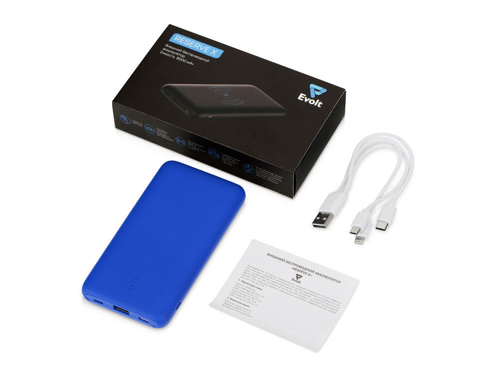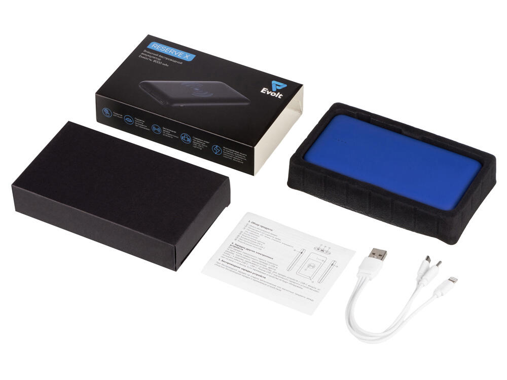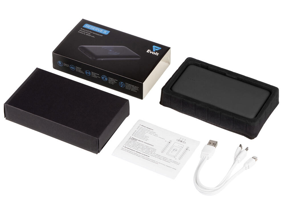 Корпус внешнего беспроводного аккумулятора Reserve X от Evolt покрыт soft touch, а при гравировке открывает подсветку логотипа. Гравировку можно компоновать с УФ-печатью, что позволит создать интересное сочетание подсвеченного контура и цветного изображения. Это — не единственный плюс: Reserve X имеет беспроводную зарядку Qi-совместимых устройств, а еще — многоуровневую защиту от нестабильного напряжения и замыканий, которая обезопасит и аккумулятор, и заряжаемый гаджет. Зарядить повербанк можно через 3 порта, зарядить от него устройство — через 2.