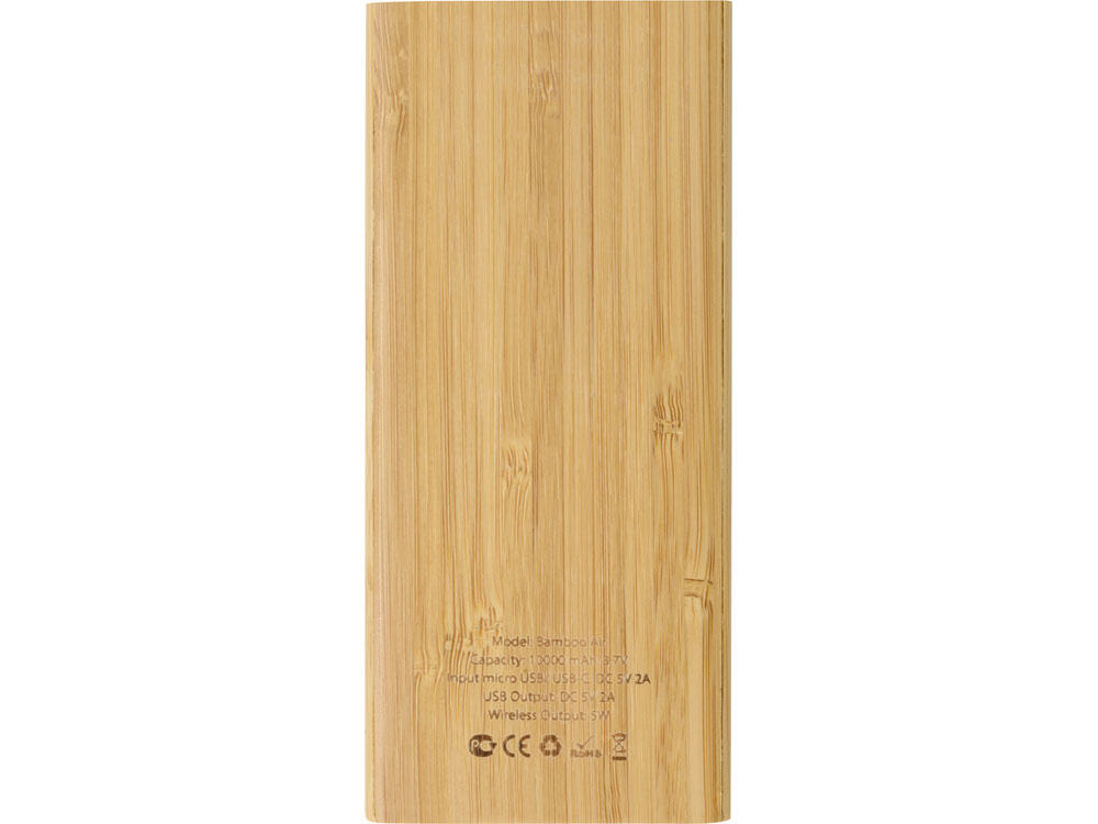 Универсальный повербанк "Bamboo Air" сочетает в себе современные технологии и натуральный материал. Поддерживает беспроводную зарядку совместимых Qi - устройств. Корпус сделан из 100% натурального бамбука без пластиковых вставок. Экологичный материал не только привлекает внимание, но имеет приятный естественный аромат и удобно лежит в руке. Повербанк имеет два выходных USB разъема, два входных разъема micro USB и USB-C и все необходимые кабели в комплекте (USB-C, micro USB и Lightning / iPhone). Полимерной литий-ионной батареи емкостью 10000 мАч в среднем хватит на несколько зарядок смартфона в зависимости от модели (2,5 -3,5 раза). Поставляется в крафт упаковке из переработанной бумаги.